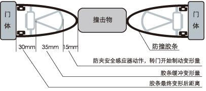 当人在转门展箱要和转门立柱相逢时,易因仍强行冲进转门而被转门夹住。胶条接触人体,在被挤压15毫米时转门开始制动直至最后停止。胶条在力作用下挤压的形变理论值为35毫米x2=70毫米。