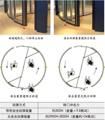 经权威测试:带安全回弹系统的自动旋转门对人体的撞击能量最大为9.8焦耳,略低于10焦耳的人体承受的安全冲撞能量,是真正意义的安全门。